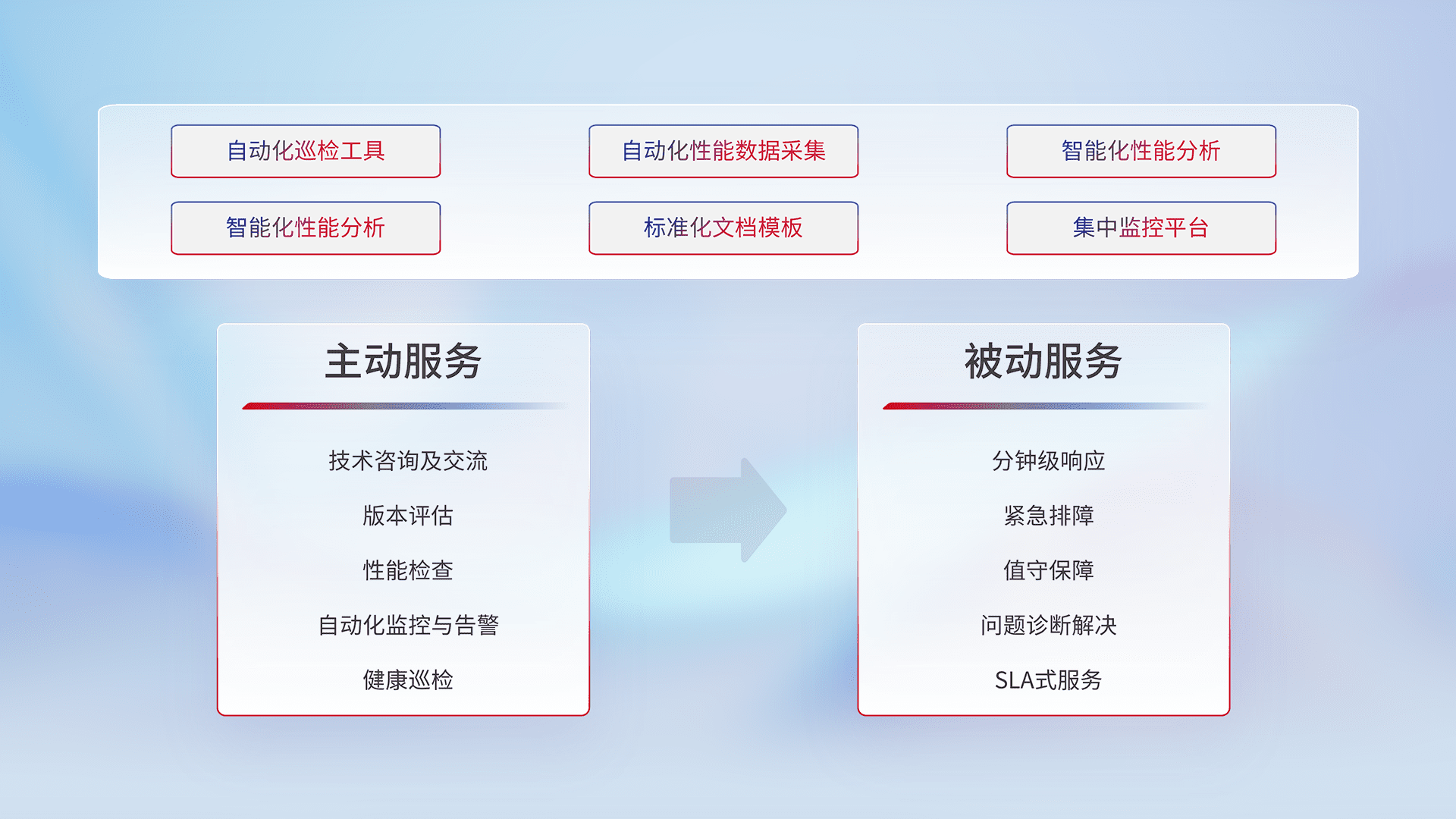 智能化工具和标准化文档,,保障服务质量,,提供主动服务(包含技术咨询、、、、版本评估、、、性能检查、、、、自动化监控与告警、、、、健康巡检)和被动服务包含(分钟级响应、、、紧急排障、、值守保障、、、问题诊断解决、、SLA服务)。。。
